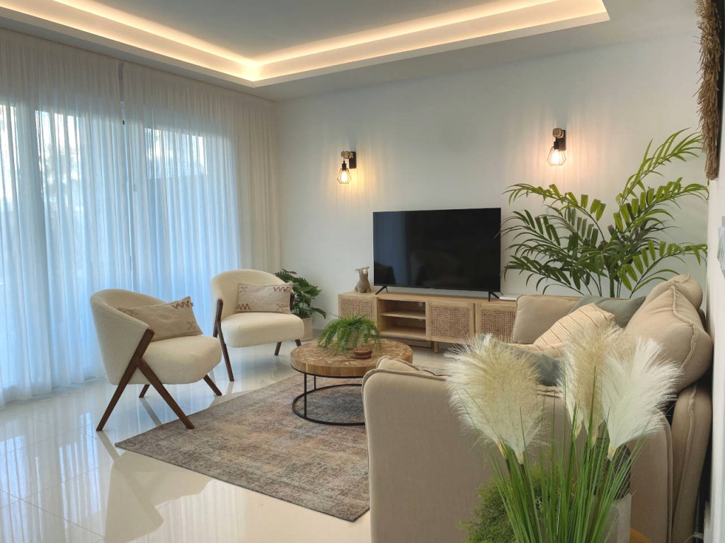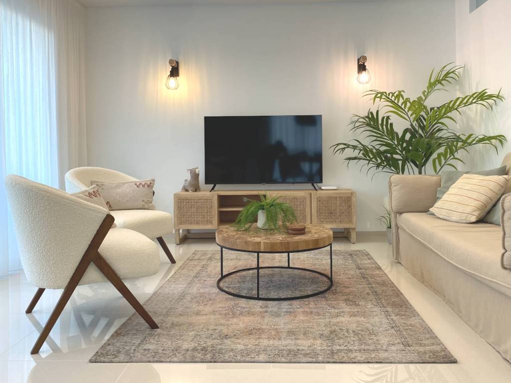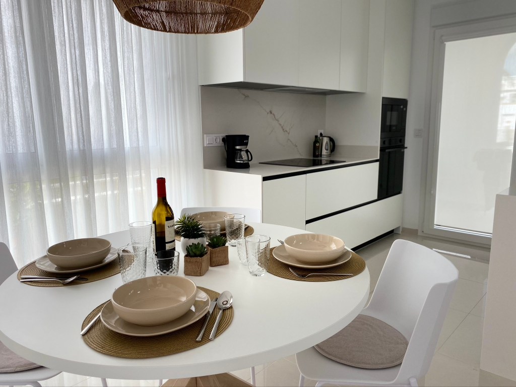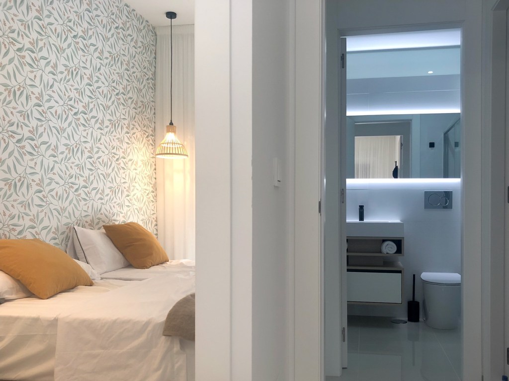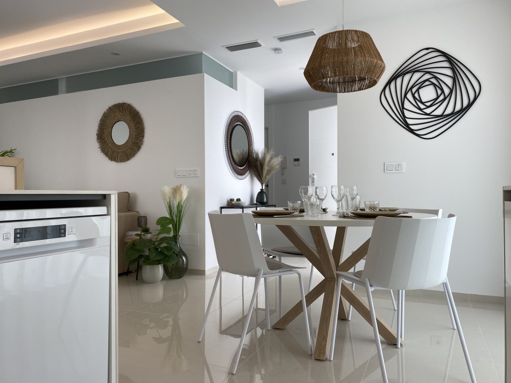 Het appartement is voorzien voor 4 personen en ligt in een kleine residentie van 20 appartementen waardoor het gezelligheid en rust uitstraalt. De afwerking van het appartement is tot in de puntjes in orde. Mediterraans aan de buitenzijde en een modern Bohemian Chic Ibiza style interieur. Je hebt twee ruime slaapkamers, twee mooie praktische badkamers, een ruime woonruimte, volledig ingerichte keuken en een zuidelijk gericht terras waarvan een gedeelte overdekt en een aanpalend zwembad. Je beschikt daarbij nog over airconditioning en een privé toegang met parkeergelegenheid. Luxueuze troeven die je laten geloven dat je in een prachtige casa vertoeft.